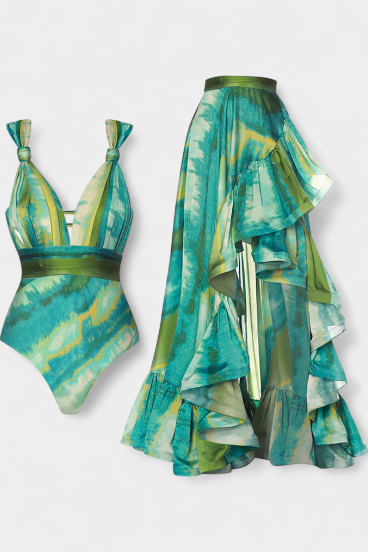 Refleja tu estilo con confianza en la playa o la piscina con el conjunto Ahria. Este set combina un bañador entero con escote en V y un vestido cubresol a juego, ideal para lucir elegante sin esfuerzo en los días de sol.