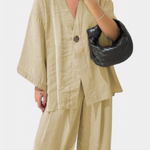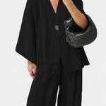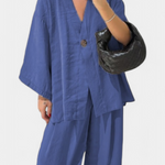 Eli combina sencillez y estilo en un conjunto versátil ideal para climas cálidos. El top de cuello en V aporta un toque relajado y favorecedor, mientras que los pantalones de corte cómodo completan un look moderno y funcional. Perfecto para días de descanso, paseos o escapadas relajadas.