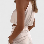 Minimalismo sofisticado con un aire ligero y relajado. El conjunto Helira reinventa la comodidad con una silueta limpia y femenina. Su top sin mangas con escote estructurado y los pantalones amplios plisados crean un equilibrio entre frescura, estilo y libertad de movimiento. Ideal para quienes buscan un look depurado sin esfuerzo.