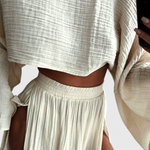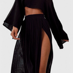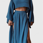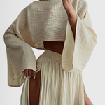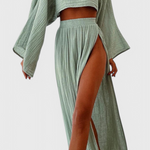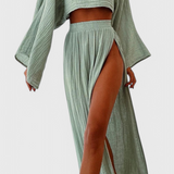 Ligero, sofisticado y hecho para impresionar—el conjunto Martha fusiona estilo moderno con una fluidez envolvente. Su top corto aireado y la falda con abertura lateral crean un equilibrio perfecto entre elegancia y frescura, ideal para días soleados o noches especiales.