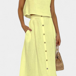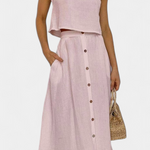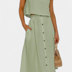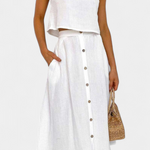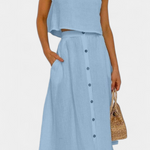 Un conjunto versátil de inspiración minimalista que respira frescura, comodidad y estilo casual. Su textura ligera de algodón, el diseño fluido y los botones decorativos lo convierten en la elección perfecta para días relajados o escapadas urbanas con encanto natural.
