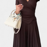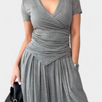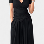 • Escote en V cruzado que estiliza y realza el busto con delicadeza