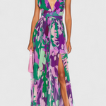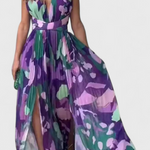 Fluido, vibrante y lleno de carácter. El vestido Cecil combina un estampado artístico en tonos lilas y verdes con una silueta ligera y abierta que se mueve con elegancia. Su escote pronunciado, espalda descubierta y detalles plisados lo convierten en una pieza protagonista para eventos, vacaciones o noches especiales al aire libre.