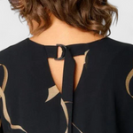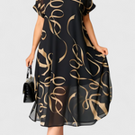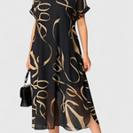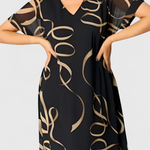 Lujo relajado con un toque artístico para un look que deslumbra sin esfuerzo. El vestido Jillian combina un estampado abstracto en tonos dorados y beige sobre fondo negro con una silueta amplia y vaporosa. Su escote en V y mangas cortas añaden elegancia natural, mientras que el tejido suave garantiza comodidad todo el día.