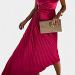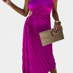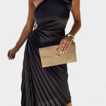 Elegancia contemporánea con un giro artístico. El vestido Leire redefine el estilo de cóctel con su silueta asimétrica de una sola manga y un delicado aplique floral en el hombro. La falda plisada fluye con movimiento refinado, creando una presencia cautivadora perfecta para celebraciones especiales.
