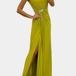 Una fusión impecable de fluidez, elegancia y presencia escénica. Shiloh destaca por su confección en tela ligera, plisado meticuloso y abertura lateral que acompaña cada movimiento con gracia. El escote cruzado enmarca delicadamente el busto, mientras que la silueta fluida alarga la figura con sutileza y sofisticación.