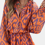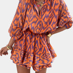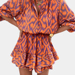 Energía vibrante con un toque despreocupado. El mono Yasmine mezcla la alegría de un vestido con la funcionalidad de un mono, gracias a su estampado ikat en tonos naranja y morado, su corte mini con volantes en capas y su silueta relajada con mangas abullonadas.